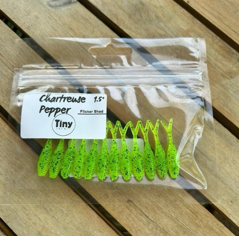 This 1.5” Double tail shad is perfect for crappie fishing or any type of river/creek. The flicker shad mimics a Baby shad in the water and is irresistible for any creek fish!